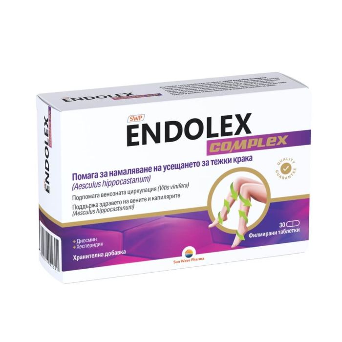 Endolex Complex е хранителна добавка с подсладител, която подпомага венозната и лимфната циркулация. Ендолекс Комплекс допринася за намаляване на усещането за тежки крака. Подпомага нормалното функциониране на вените, капилярите и лимфните съдове. Допринася за поддържане на нормалния тонус на съдовите стени. SWP Endolex complex съдържа микронизирана фракция биофлавоноиди (диосмин и хесперидин), извлечени от кората на цитрусови плодове; микронизираната форма осигурява по-добра абсорбция на диосмин и хесперидин.