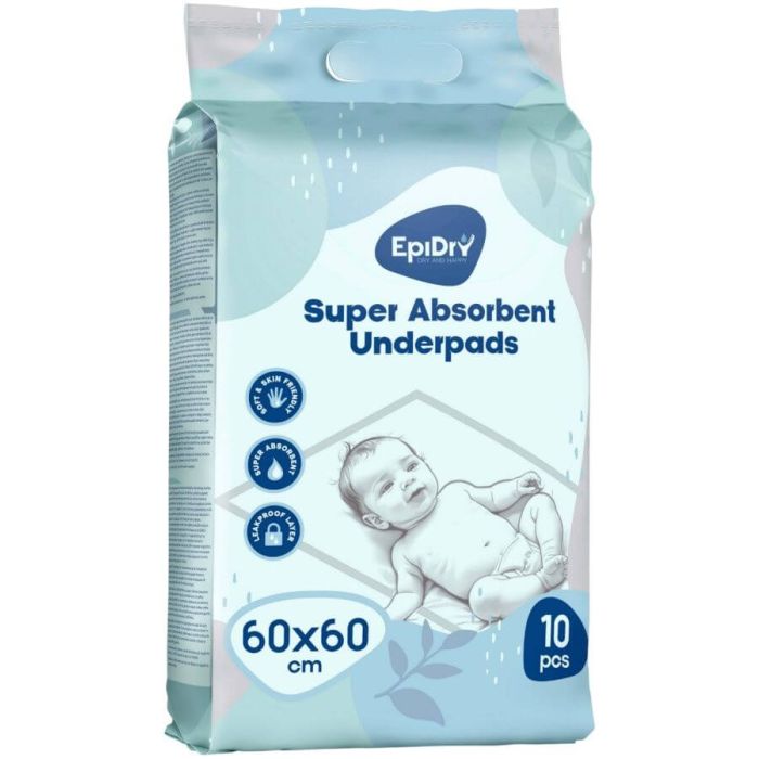 EpiDry Super Absorbent Underpads са полезен аксесоар при смяна на пелените вкъщи, по време на разходка или на път. ЕпиДрай Подложки за повиване за еднократна употреба имат мек и безопасен горен слой, който е нежен на допир до кожата на бебето. Тяхната 5-слойна структура е с водонепропускливи и силноабсорбиращи свойства. Ромбоидната структура на слоевете концентрира течността, а абсорбиращият полимер ефективно попива влагата и я задържа вътре в подложката, като по този начин поддържа кожата на бебето суха и предотвратява дразнене. Освен за преповиване на детето, те могат да се използват и като протектор за матрак, за периода след раждане и като допълнение към абсорбиращите продукти за инконтиненция. Подложките са едно разумно предложение за всички родители с динамичен начин на живот. Меки, удобни и хигиенични, те улесняват родителите във всекидневната грижа за бебето.