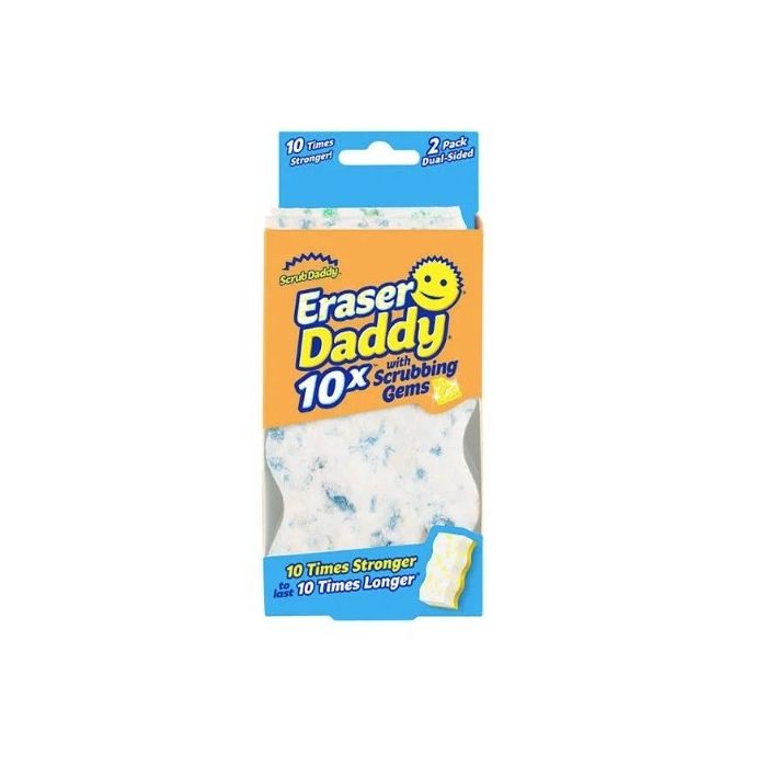 Scrub Daddy Eraser Daddy е двуслойна „магическа“ гъба, съчетание от трикомпозитен гумичков (ерейзър) материал и гъвкава полимерна пяна FlexTexture®. При контакт с вода се активира технологията ED10x, която позволява ефективно премахване на следи, драскотини и петна, подобно на традиционна меламинова гума. Издържа до 10 пъти повече от обичайните меламин гъби. Задният слой ефективно премахва петна и наслоени замърсявания без необходимост от препарат. Скръб Дади Ерейзър Дади Двуслойна домакинска гъба е предназначена за многократна употреба и е подходяща за различни повърхности.