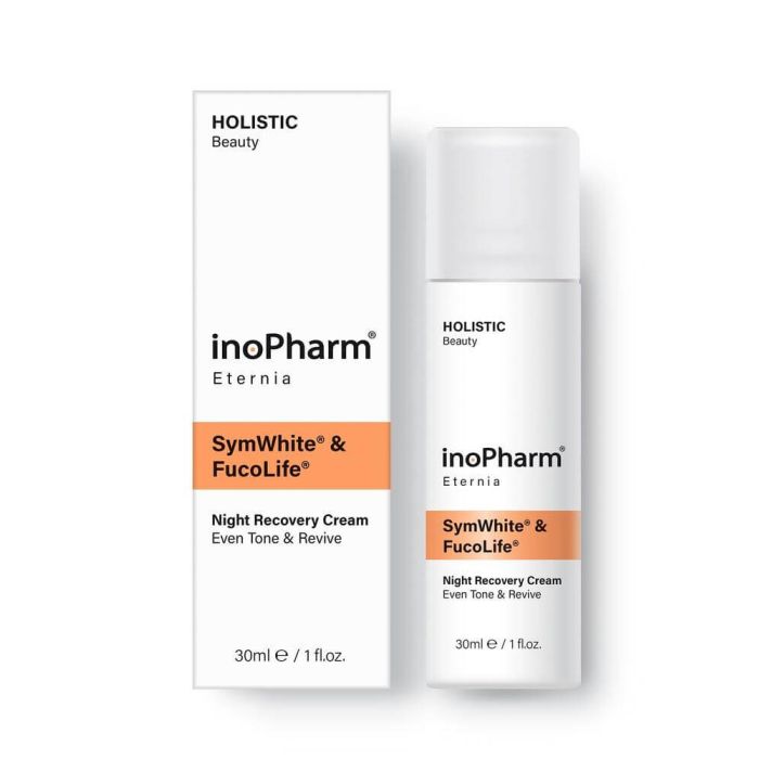 InoPharm Eternia Night Recovery Cream е нощен възстановяващ крем, специално създаден за зряла кожа. Формулата, обогатена с изключителните съставки SymWhite® и FucoLife®, стимулира естествените регенеративни процеси на кожата. Оказва грижа при пигментни петна, като подобрява състоянието на кожата, загубила блясък, оставяйки тена сияен. Осигурява усещане за по-стегната кожа. Инофарм Етерния Възстановяващ нощен крем за лице е дерматологично тестван.
