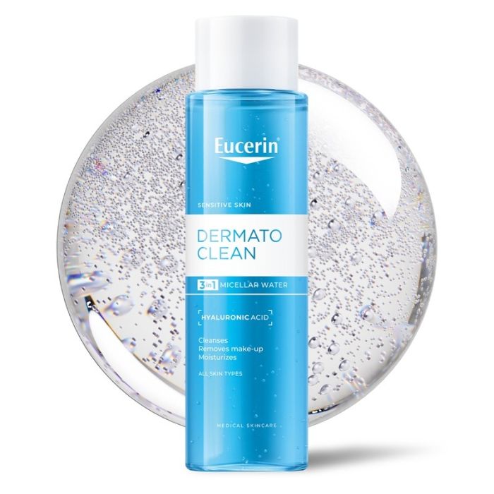 Eucerin DermatoClean Hyaluron Micellar Cleansing Fluid 3в1 for All Skin types е почистваща мицеларна вода за лице подходяща за всеки тип кожа. Мицеларният разтвор нежно отстранява всички замърсявания и грим, дори водоустойчив. Специалната формула съдържа ефикасен и нежно почистващ комплекс и хиалуронова киселина, доставяща интензивна хидратация. Еуцерин (Юсерин) ДерматоКлийн Хиалурон Мицеларна почистваща вода 3в1 за всеки тип кожа е без парабени. Дерматологично и офталмологично тестван продукт. Некомедогенен.