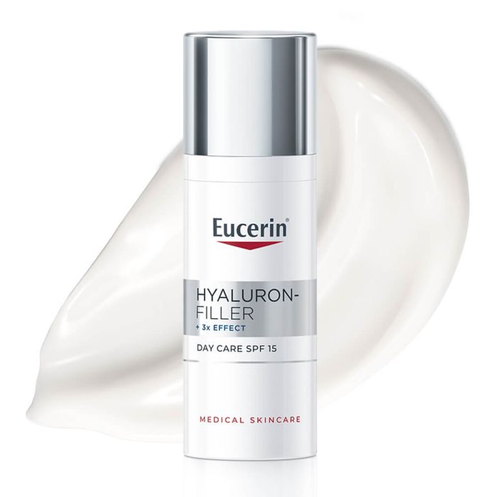 Eucerin Hyaluron-Filler Day Cream SPF15 for Normal and Combination Skin е подходящ за нормална и комбинирана кожа. Ефективен дневен крем, който запълва дори най-дълбоките бръчки и осигурява UVA и UVB защита. Формулата съдържа иновативната комбинация на Eucerin от хиалуронова киселина с високо и ниско молекулярно тегло и глицин-сапонин, която прониква в дълбочина в кожата, интензивно хидратира, видимо запълва всички бръчки и подмладява вида на кожата. Еуцерин (Юсерин) Хиаурон-Филър Дневен крем за нормална и комбинирана кожа със слънцезащитен фактор SPF15 и UVA филтър предлага ефективна защита от вредните слънчеви лъчи, преждевременното стареене на кожата и задълбочаването на бръчките. След употреба кожата изглежда значително по-млада, по-гладка и с изравнен тен. Кремът има немазна структура и осигурява отлична основа за фон дьо тен (ако е необходимо допълнително покритие) и друг грим. Има лек аромат. Без парабени. Дерматологично тестван продукт. Некомедогенен.