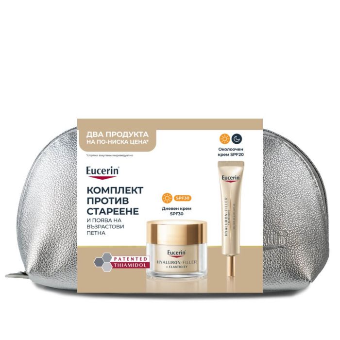 Комплектът съдържа: Eucerin Hyaluron-Filler + Elasticity Дневен крем за всеки тип кожа SPF30 50 мл. 1 бр. + Eucerin Hyaluron-Filler + Elasticity Околоочен крем SPF20 15 мл. 1 бр. + Несесер 1 бр.
