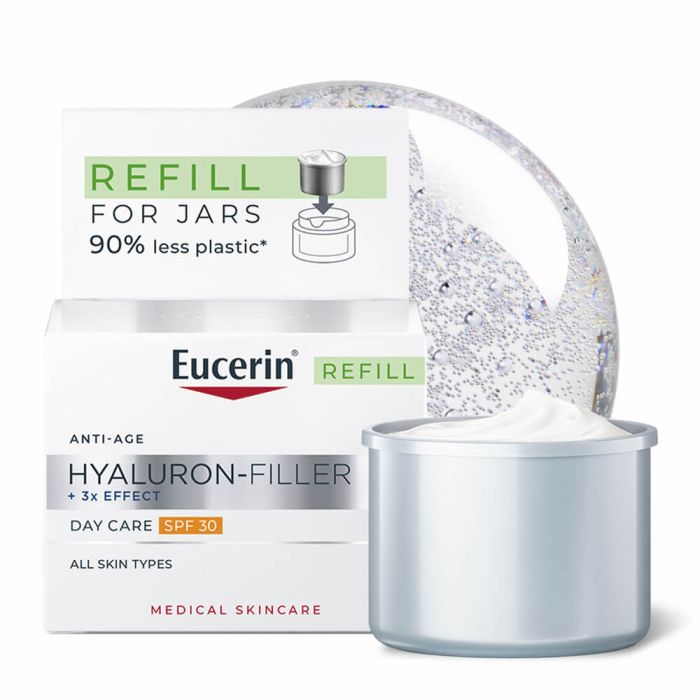 Eucerin Hyaluron-Filler Day Cream SPF 30 е дневен крем против стареене с хиалуронова киселина, сапонин и еноксолон. Подходящ за всеки тип кожа. Кремът запълва дори най-дълбоките бръчки и осигурява UVA и UVB защита. Формулата съдържа иновативната комбинация на Eucerin от хиалуронова киселина с високо и ниско молекулярно тегло, която прониква в дълбочина в кожата, интензивно хидратира, видимо запълва дори дълбоките бръчки и подмладява вида на кожата. Извлеченият от соя био-активен глицин-сапонин е доказан като едно от най-ефективните вещества за стимулиране на естественото производство на хиалуронова киселина в кожата. Еноксолонът, известен още като глицеритинова киселина, се извлича от корен на женско биле. Той подтиска ензимът, който разгражда хиалуроновата киселина (хиалуронидазата, HYAL1) и по този начин редуцира разграждането на хиалурон с над 50%. Еуцерин (Юсерин) Хиаурон-Филър Дневен крем с SPF30 и UVA филтър за всеки тип кожа предлага ефективна защита от вредните слънчеви лъчи, преждевременното стареене на кожата и задълбочаването на бръчките. След употреба кожата изглежда значително по-млада, по-гладка и с изравнен тен. Кремът има немазна структура и осигурява отлична основа за фон дьо тен (ако е необходимо допълнително покритие) и друг грим. Има лек аромат. Без парабени. Дерматологично тестван продукт. Некомедогенен. Пълнителят е устойчив, изработен с ограничено количество пластмаса и е съвместм с всеки от продуктите на Еуцерин за лице с бурканче.