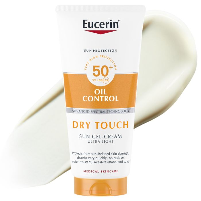 Eucerin Sun Oil Control Dry Touch Gel-cream SPF50+ е слънцезащитен крем за тяло за мазна кожа. Специалната формула има Advanced Spectral Technology, която комбинира широколентови и фотостабилни UVA/UVB филтри за много висока UV защита с Ликохалкон А за неутрализиране на свободните радикали, активирани от UV лъчи и HEVIS светлина. Себум регулиращата технология против омазняване на кожата с Карнитин и абсорбиращите микрочастици придават на кожата незабавно усещане за сухота при докосване и дълготраен ефект против лъщене на кожата до осем часа. Еуцерин (Юсерин) Сън Ойл Контрол Слънцезащитен гел-крем за тяло с фактор SPF50+ има ултралека, немазна текстура, която попива бързо и има добра поносимост дори при чувствителна и акнетична кожа. Кремът е едновременно без аромат и изключително водоустойчив. Без парабени. Дерматологично тестван продукт. Некомедогенен.