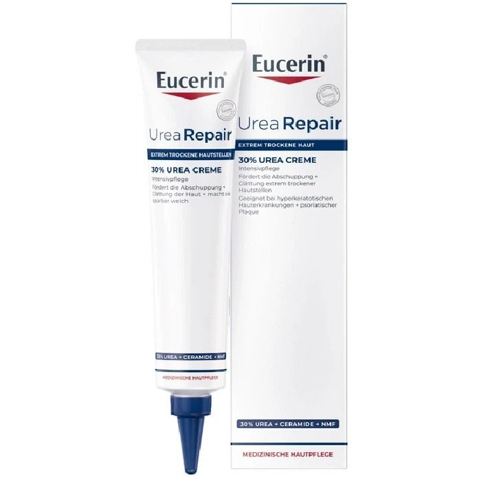 Eucerin UreaRepair cream 30% Urea e крем, предназначен за много суха и загрубяла кожа на тялото, в участъците където е напукана или удебелена, при лющене и плаки. Кремът съдържа уникална комбинация от съставки – висока концентрация на Уреа (30%) за ексфолиране, Серамиди и други естествени хидратиращи фактори (NMFs) – които задържат вода и възстановяват естествената защитна бариера на кожата, за да предотвратят допълнителна загуба на хидратация. Еуцерин (Юсерин) Уреа Рипеър Интензивен крем за локално третиране с 30% урея осигурява незабавно облекчение, интензивна и дълготрайна хидратация, забавяйки проявата на признаците на сухота до 48 часа. Кремът е подходящ за зони с хиперкератотична (медицинския термин за удебелена) кожа и за хора с кератоза пиларис и псориазис. Може да се използва и като допълваща грижа в комбинация с лечение, предписано от вашия дерматолог. Дерматологично тестван продукт. Не съдържа парфюм.