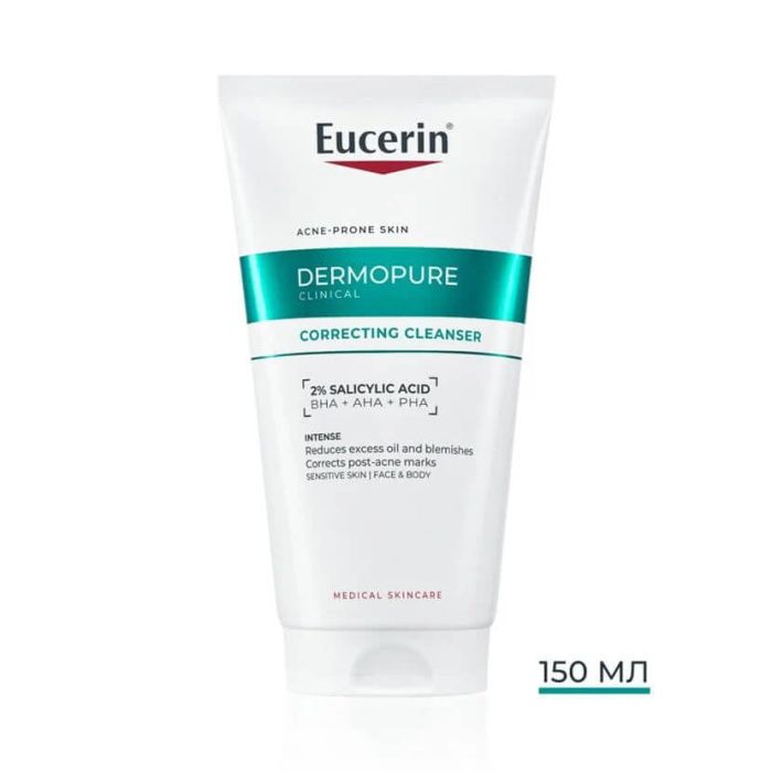 Eucerin Dermopure Clinical Correcting Cleanser e коригиращ измиващ гел за лице и тяло, който намалява прекомерното омазняване и несъвършенствата и спомага за корекция на петната след акне. Подходящ за мазна кожа и кожа склонна към акне, включително чувствителна. Еуцерин (Юсерин) Дермопюр Клиникъл Коригиращ измиващ гел съдържа концентрация от 2% салицилова киселина (BHA), гликолова киселина (AHA) и Глюконолактон (PHA). Действа още от първия ден на употреба. Подходящ от 12-годишна възраст. Без парабени. Дерматологично тестван продукт.