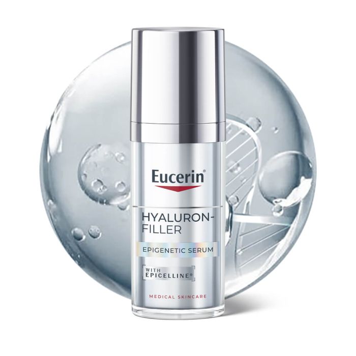 Eucerin Hyaluron Filler Epigentic Серум против стареене представлява висококачествен серум за лице, който е специално разработен да намалява признаците на стареене. Активната формула е с хиалуронова киселина, която овлажнява и изглажда фините линии. Серума прониква дълбоко в епидермалните слоеве и запълва дори и най-упоритите бръчки. Еусерин Хиалурон Филър Епиджентик серум против стареене стимулира процеса на регенериране на кожата и доставя усещане за гладка, стегната и мека кожа. Нежната текстура на продукта е лесна за нанасяне и приятна за употреба. Без парабени. Дерматологично тестван продукт. Некомедогенен.
