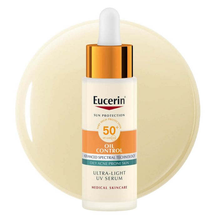 Eucerin Oil Control SPF50+ Ultra Light UV Serum е ултра лека формула подходяща за нуждите на мазната и комбинирана кожа. Леката му текстура попива бързо и осигурява моментално сухо усещане, като същевременно поддържа дълготраен контрол върху нежеланото лъщене. Формулата е обогатена с Anti-Pollution Vitamin Booster, който подпомага неутрализирането на свободните радикали и засилва естествената защита на кожата срещу оксидативния стрес в градска среда. Продуктът видимо редуцира омазняването и спомага за балансиране на себумната секреция през целия ден. Разнася се равномерно, без да оставя бял или тежък филм, което го прави отлична основа за грим с гладък и невидим финиш. Некомедогенната формула не запушва порите и не съдържа аромат, което я прави подходяща и за чувствителна кожа. Формулата е устойчива на пот и високи нива на влажност. Еуцерин (Юсерин) Сън Ойл Контрол Серум за лице SPF50+ е създаден за ежедневна употреба и осигурява надеждна слънцезащита, включително срещу синя светлина. Некомедогенен, без аромат.