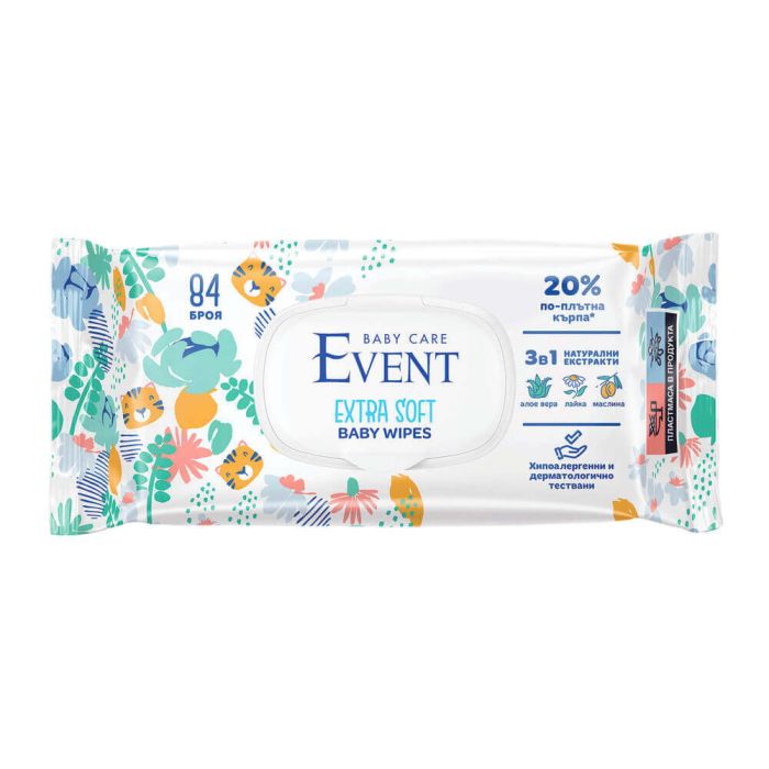 Event Baby extra soft 3in1 са бебешки мокри кърпи 3в1 с натурални екстракти от алое, лайка и маслина. Евент Бебе Екста Софт 3 в 1 Мокри кърпи с алое, лайка и маслина са направени от специален фин нетъкан текстил, изключително нежен към кожата на вашето бебе и са 20% по-плътни. Кърпичките деликатно почистват, успокояват и овлажняват нежната бебешка кожа, като същевременно поддържат нивото на Ph. След използването им, кожата на бебето е здрава, гладка и копринено мека. Подходящи са за използване при смяна на пелените, при хранене, за разходка навън и др. Натурална формула с екстракти от алое, лайка и маслина, които имат хидратиращо, успокояващо и подхранващо кожата действие. Не съдържат алкохол. Дерматологично тествани. Хипоалергенни.