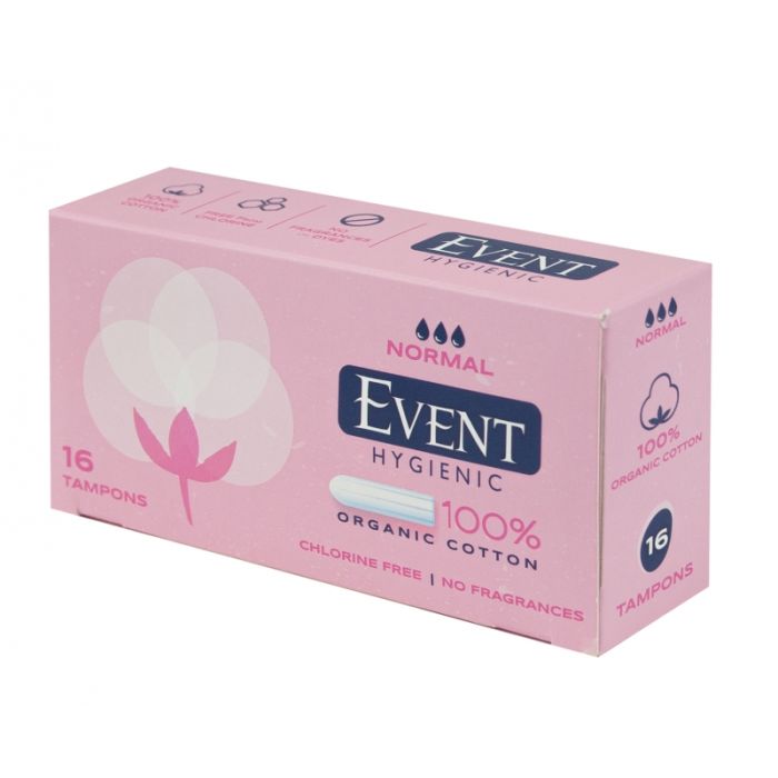Event Normal Оrganic Cotton са тампони от 100% органичен памук за използване при средно обилна менструация. Изработени са от естествени влакна с висока хигроскопичност, а специалната им структура, бързо отвежда течността в сърцевината. По този начин набъбват равномерно и риска от протичане се свежда до минимум. Благодарение на заобления връх и фината гладка повърхност, Евент Нормал Органик Котън тампони се слагат и отстраняват изключително лесно. С тях се чувствате комфортно, сигурно и уверено в дните на вашия цикъл. Предлагат се в опаковка от 16 броя.