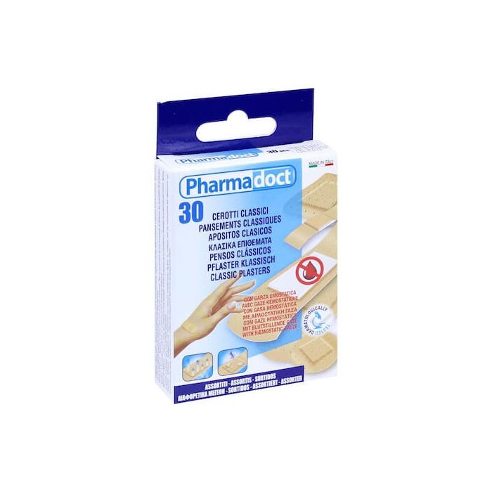 Pharmadoct Classic Хемостатичен водоустойчив пластир абсорбира кръвта, която коагулира при контакт с марлената възглавничка помагайки на заздравяващия процес. Фармадокт Класик Хемостатичен водоустойчив пластир е в 5 размера.
