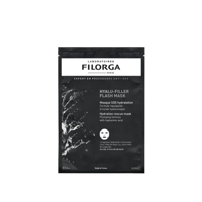 Filorga Hyalu-Filler Flash Mask e хидратираща шийт маска с изглаждащо и изпълващо действие. Обогатена с два типа хиалуронова киселина (с високо и средно молекулно тегло) за интензивна и продължителна 24-часова хидратация. Филорга Хиалу-Филър Шийт маска за лице има незабавен хидратиращ ефект, само за 60 секунди кожата е видимо по-плътна, гладка и освежена. Ултра свежа гел-крем текстура, която оставя кожата хидратирана и успокоена. Подходяща за: Мъже и жени. За нормална до суха кожа, включително чувствителна. Дерматологично тестван продукт.