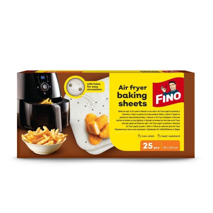 Fino хартия за печене за еър фрайър са листове, предназначени за използване в еър фрайър, които улесняват почистването на кошницата и я предпазват от залепване на хранителни остатъци. Фино хартия за печене за еър фрайър е проектирана да издържа на висока температура, а перфорацията ѝ допринася за по-добро разпределение на топлината и осигурява равномерно готвене.