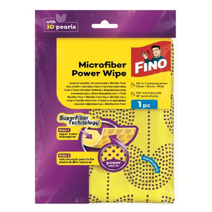 FINO Microfiber Power е иновативна почистваща кърпа от ново поколение, която ефективно почиства различни повърхности без нужда от допълнителни почистващи препарати. Тя премахва упорити замърсявания, без да надрасква, благодарение на високата си абсорбираща способност. Едната й страна е разработена с технологията SuperFiber и е идеална за забърсване и почистване, а другата е с 3D „перли“, които лесно справят с петна и по-трудни замърсявания без да повреждат повърхностите. Кърпата премахва прах, ивици и замърсявания само с вода, без да оставя следи или власинки. Създадена е за по-лесно и ефективно почистване и е подходяща за множество приложения в дома. Фино Микрофибърна суперпочистваща кърпа с 3D перли е лесна за използване и поддръжка.