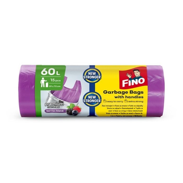 Fino Smart Handles торби за смет са с практични дръжки и са най-добрият избор за удобно и лесно затваряне, поддържане и носене. Те са изключително здрави, решени в лилав цвят. Тези торби са идеални за по-големи кошове и също така се използват често в производствена среда. Фино Цветни торби за смет с дръжки са с аромат на горски плодове.