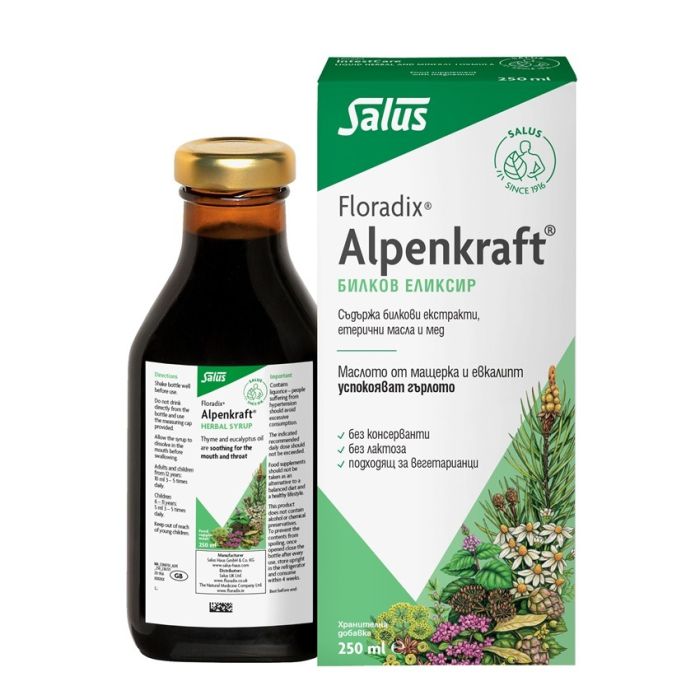Floradix Alpenkraft представлява билков сироп с мед и малцов екстракт, грижа за здраво гърло. Флорадикс Алпенкрафт Билков еликсир съчетава в себе си специално подбрани билки за успокояване на гърлото и дихателните пътища. Екстрактите от мащерка, анасон, копър и лайка действат дезинфекциращо в устната кухина, а комбинацията от етерични масла ефективно повлиява сухата кашлица. Билковият еликсир разбива секрета в белите дробове и така улеснява изхвърлянето му. Сиропът е подходящ за прием при настинка, кашлица, зачервено гърло и раздразнени бели дробове. Може да се приема от професионални певци, говорители и хора изложени на цигарен или индустриален дим. Продуктът не съдържа алкохол или химически консерванти.
