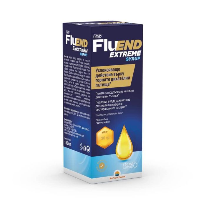 ФлуЕнд сироп е продукт създаден да поддържа нормалното ниво на секретите в долните дихателни пътища. Сиропът улеснява дишането и подпомага здравето на горните дихателни пътища. ФлуЕнд сироп съдържа растителни екстракти от нар, джинджифил, пипер, босилек, женско биле, канела, куркума, горска теменуга, кардамон, пчелен мед. Целият набор от съставки подпомага имунната система. Продуктът е подходящ при простуда и грип през зимния сезон.