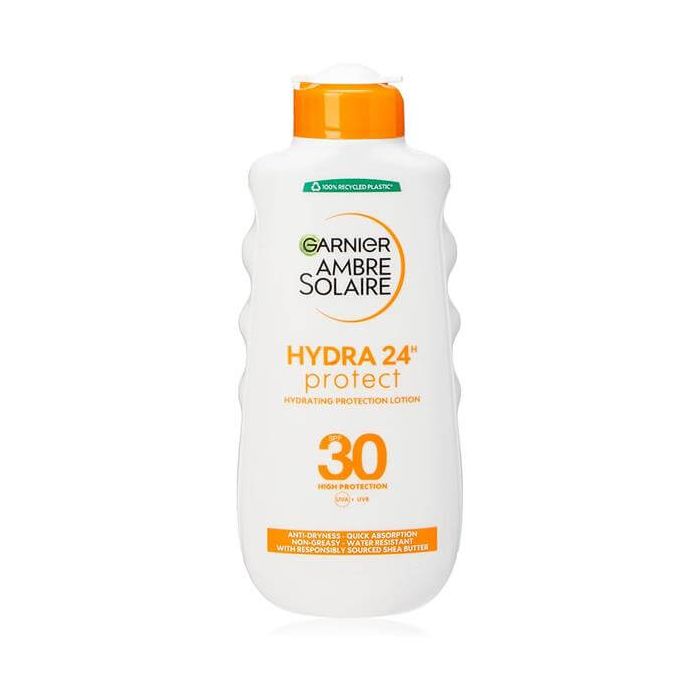 Garnier Ambre Solaire Hydra Protect Lotion SPF30 е слънцезащитен лосион с висок фактор, който предпазва от UVB, UVA и дълги UVA лъчи, предотвратявайки незабавно слънчевото изгаряне и дълготрайното увреждане на кожата. Хидратиращата формула предпазва кожата от изсушаване и я прави нежна и мека. Гарние Амбре Солер Хидра Протект Слънцезащитен лосион SPF50+ осигурява висока защита и хидратация на кожата. Обогатено е с масло от ший, което активно я подхранва, а патентованата система на филтриране съдържа Mexoryl SX, който предпазва от въздействието на вредните слънчеви лъчи. Формулата е разработена съгласно европейските стандарти за защита от вредното въздействие на UVA/UVB лъчите чрез специална технология с UV филтри. Тя предлага ефективна защита, като не оставя нежелани бели следи и има лека текстура, която не лепне. 3а много светла кожа, чувствителна към слънцето. Тестван под дерматологичен контрол.