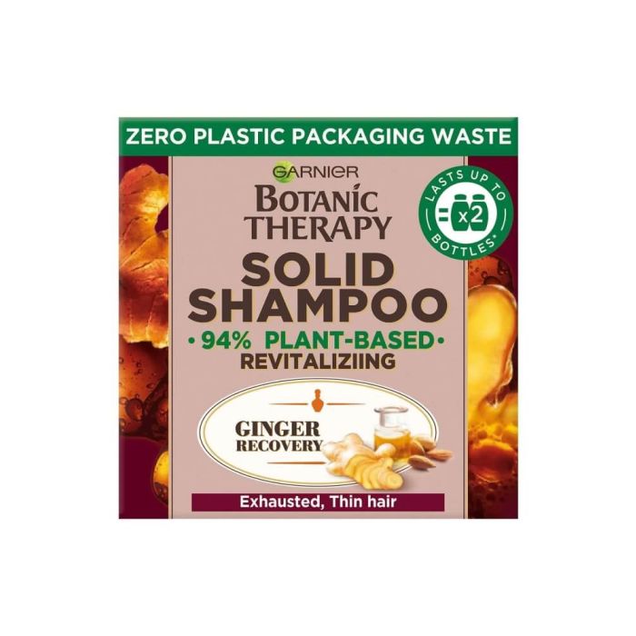 Garnier Botanic Therapy Ginger Recovery Hair Solid Shampoo е ревитализиращ твърд шампоан за слаба и тънка коса без обем. Обогатена е с екстракт от корен на джинджифил, който съдържа витамини и антиоксиданти. Той връща жизнеността и блясъка на косата, прави я по-силна и по-здрава отвътре. Вложеното масло от бадем интензивно хидратира, подхранва и омекотява косъма. Шампоанът нежно почиства скалпа и фината косата, подсилва нейната структура и ѝ придава обем и блясък. Гарние Ботаник Терапи Ревитализиращ твърд шампоан с джинджифил и бадемово масло за изтощена и тънка коса съдържа 94% съставки от растителен произход. Биоразградима формула. Дерматологично тестван продукт. Твърдият шампоан се предлага в 100% рециклируема и сертифицирана по FSC картонена опаковка.