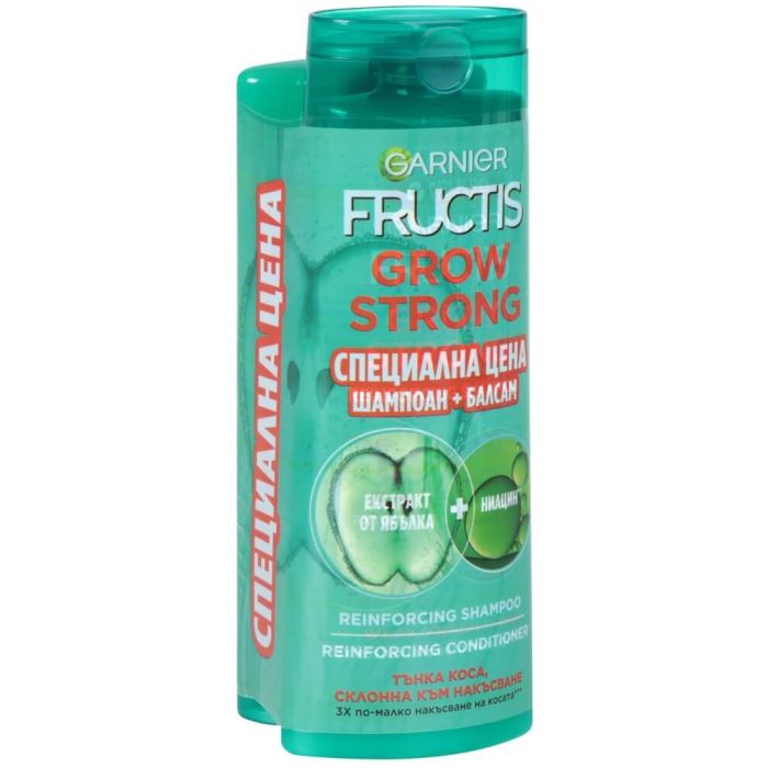 Garnier Fructis Grow Strong Shampoo for Weakened Hair е шампоан за коса, който ефикасно и нежно почиства, засилва растежа на косата и я дарява с повече сила и жизненост. Подходящ за тънка, увредена и късаща се коса. Гарние Фруктис Гроу Стронг Шампоан за заздравяване и растеж на косата заздравява и регенерира косата, като предотвратява нейното накъсване. Силата му се дължи на уникална комбинация от серамиди и активен плодов концентрат. Серамидите спомагат възстановяването на липидите в структурата на увредената коса и подсилват косъма, от корена до върха, а плодовият концентрат осигурява ценни подхранващи вещества. Растителни екстракти от кората на лимон, захарна тръстика, зелен чай и ябълка оказват изключително благоприятно действие върху състоянието на косата. Тя е добре хидратирана, подхранена и защитена, за да расте силна и здрава. Консистенцията на шампоана формира плътна пяна, която почиства замърсяванията и оставя след себе си приятен аромат. При редовна употреба, тя е 10 пъти по-устойчива на накъсване. Тя изглежда обновена, жизнена и изпълнена с блясък. Без парабени. Дерматологично тестван продукт.