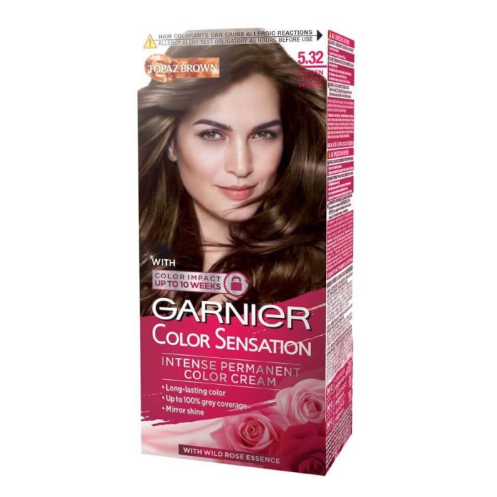 Garnier Color Sensation Topaze 5.32 е трайна боя за коса с високо устойчиви пигменти за постигане на най-интензивни, дълготрайни и сензационни нюанси, с които дамите няма да останат незабелязани. Боята за коса на Garnier е рaзкошна разкрасяваща грижа, обогатена с екстракт от седеф, който дарява косата с копринена мекота при допир и огледален блясък. Гарниер Колор Сенсейшън Топаз Боя за коса 5.32 осигурява 100% покритие на белите коси. Кремообразната ѝ текстура се нанася с лекота, без да се разтича и има приятен аромат. Оставя мека и приятна на допир коса, лесна за стилизиране. Наситените цветни пигменти създават феерия от цвят. Косата има здрав, жизнен и бляскав вид!