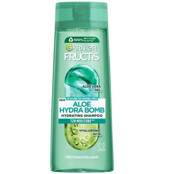 Garnier Fructis Aloe Hydra Bomb Shampoo е хидратиращ шампоан, който е специално предназначен за нормална коса и е обогатен с алое вера. Гарние Фруктис Алое Хидра Бомб Хидратиращ шампоан за нормална коса с алое вера почиства и хидратира дълбоко косата, правейки я мека и еластична. Формулата му е обогатена със сок от алое вера от естествен произход, който притежава хидратиращи, подхранващи и противовъзпалителни свойства. Включеният растителен глицерин, помага за укрепване структурата на косъма. Шампоанът е с лека формула и е подходящ за ежедневна употреба. Той оставя косата мека, хидратирана и с естествено леко усещане до 3-тия ден. Формулата е с дерматологично потвърдена съвместимост с кожата, не съдържа силикони и не утежнява.