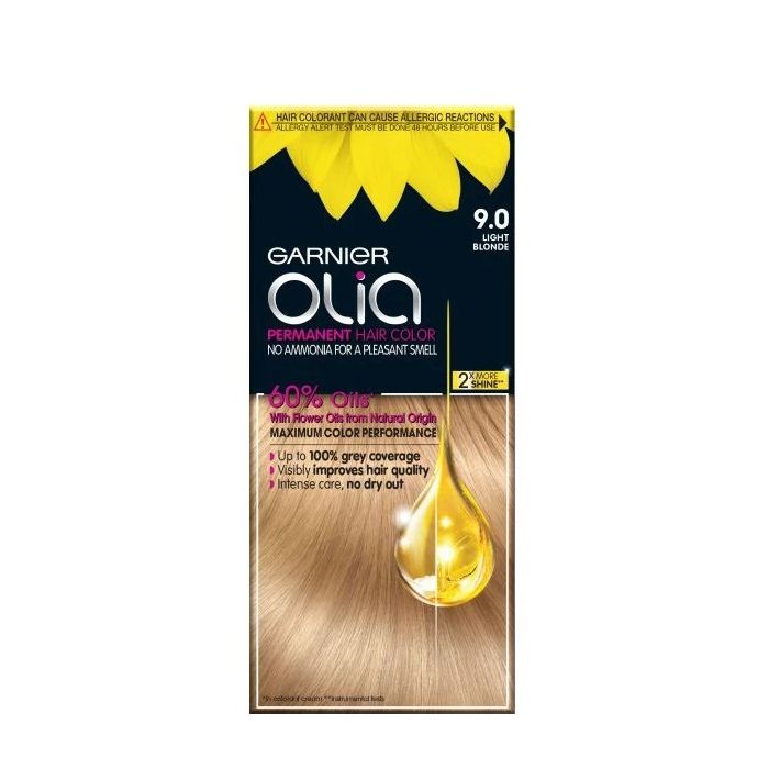 Garnier Olia 9.0 е трайна боя за коса, без съдържание на амоняк, базирана на комплекс от 60% концентрирани растителни масла, които не просто подхранват, но и разкриват цвета от сърцевината на косъма. Боята подхранва корените и кожата на главата, съхранява естествената им влага и прави косата блестяща, силна и изпълнена с живот. Уникалната формула на Гарниер Олиа Боя за коса 9.0 съдържа масла от камелия (Camellia), слънчоглед (Sunflower), пасифлора (Passion Flower) и ливадина (Limnanthes Alba). Тези масла са били използвани в продължение на векове за грижа и защита на косъма и скалпа. Продуктът притежава изключителна покривност и наситеност на цвета, като покрива до 100% сивите коси и изсветлява до 3 тона от основния цвят. Кадифено гладката текстура на боята се нанася лесно и не се разтича. Боята подобрява видимо състоянието на косата, оставяйки я блестяща и мека, с невероятно наситен цвят за дълго време. Консистенцията на Olia има деликатен аромат на цветя и щади скалпа.