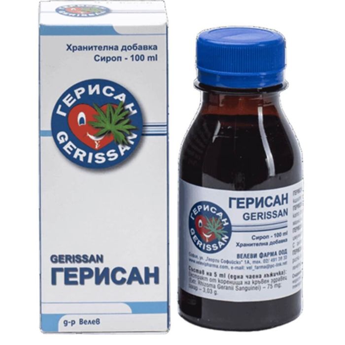 Gerissan Сироп при анемия и слаб имунитет е висококачествена хранителна добавка с екстракт от коренища на кръвен здравец. Герисан Сироп при анемия и слаб имунитет осигурява мощен антиоксидантен ефект, тъй като коренищата на кръвен здравец съдържат голямо количество танини, флавоноиди, проантоцианидини, антоциани, полифенолни киселини. Продуктът също така нормализира нивата на хемоглобин в случай на анемия, оказва защита на организма от вируси и бактерии. Отличава се още със своя имуноподсилващ ефект. Също така нормализира нивата на кръвната захар.