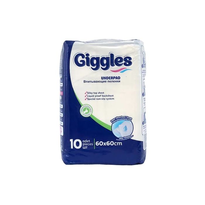 Giggles Underpad представляват еднократни абсорбиращи чаршафи, които са предназначени за защита на матраци, дивани, инвалидни колички или други повърхности от замърсяване и влага. Подходящи са за бебета, деца, възрастни и хора с ограничена подвижност. Гигълс Еднократни абсорбиращи чаршафи осигуряват високо ниво на комфорт и надеждна защита благодарение на своята многослойна структура: