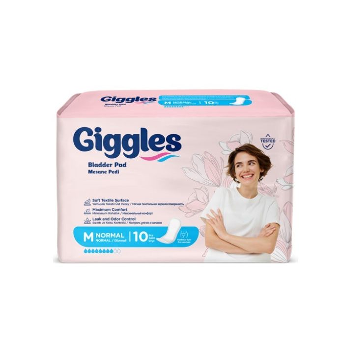 Giggles урологични подложки за жени са медицински продукт, подходящ при лека до умерена инконтиненция, създаден да осигури надеждна защита и комфорт през целия ден. Подложките са тънки и дискретни, с висока попивателна способност – задържат течности и неутрализират неприятни миризми. Изработени са от меки, дишащи материали, които щадят чувствителната кожа. Анатомичната форма осигурява отлично прилягане към тялото, без риск от разместване. Giggles урологични подложки за жени разполагат и с ленти, предпазващи от странично протичане.