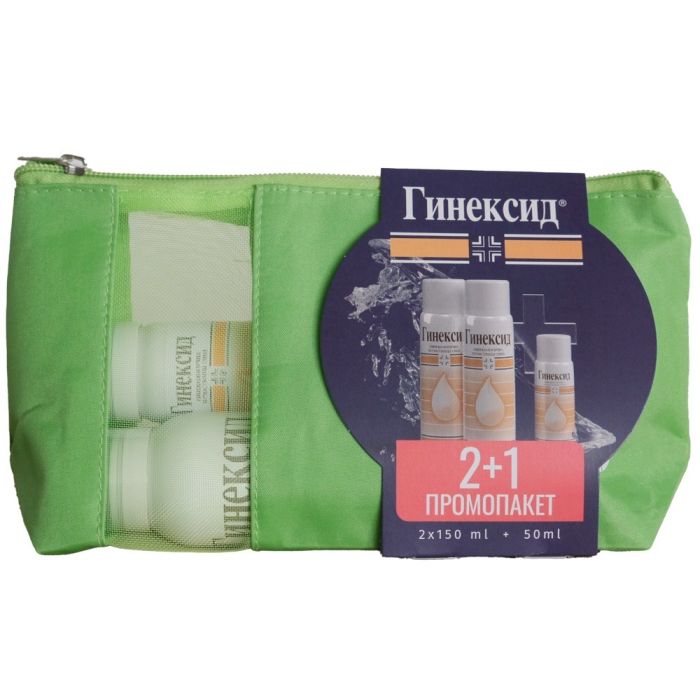 Комплектът съдържа: Гинексид Гинекологична почистваща пяна 150 мл. 2 бр. + Гинексид Гинекологична почистваща пяна 50мл. 1 бр. + Несесер