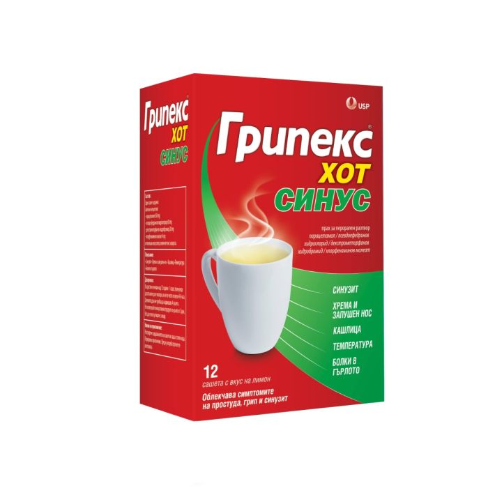 Грипекс Хот Синус при грип, простуда и синузит с вкус на лимон x 12 сашета US Pharmacia е комбинирано лекарствено средство, без лекарско предписание, под формата на прах за перорален разтвор. Първата комплексна формула в сашетна форма, специално подбрана за синуси при настинка и грип. Съдържа четири съставки за всички симптоми на настинка и синузит: парацетамол, псевдоефедрин, декстрометорфан, хлорфенамин. Започва да работи след 10 мин, а ефектът продължава до 6 часа. Грипекс ХотСинус има антипиретично и аналгетично действие, отпушва носа и синусите, намалява отока на носната лигавица и улеснява дишането, потиска сухата и упорита кашлица, инхибира производството на секрети, кихането, хремата и сълзене. Предлага се в опаковка от 12 сашета.
