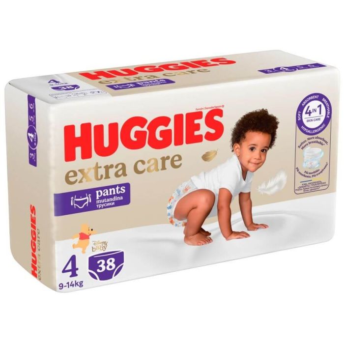 Huggies Extra Care Pants са удобни пелени-гащички за еднократна употреба, създадени специално за деца с тегло между 9 и 14 кг. Те осигуряват надеждна защита, изключителна мекота и свобода на движение както през деня, така и през нощта. Изработени от деликатни, дишащи материи с микропори, които позволяват на кожата да остане суха и свежа. Меките предпазни възглавнички формират щадяща бариера между влагата и нежната бебешка кожа, докато абсорбиращият слой попива течностите за секунди. Вграден предпазен джоб предотвратява нежелано протичане. Благодарение на гъвкавия и мек колан, пелените приляга плътно и удобно, а обличането и събуването им е лесно и бързо, което улеснява при приучаване към гърне. Индикаторът за влага сменя цвета си при нужда от смяна, а веселите Disney илюстрации правят ежедневната грижа по-забавна. Хъгис Екстра Кеър Пелени гащи са без добавен парфюм, хлор и латекс. Дерматологично изпитани за чувствителна кожа.