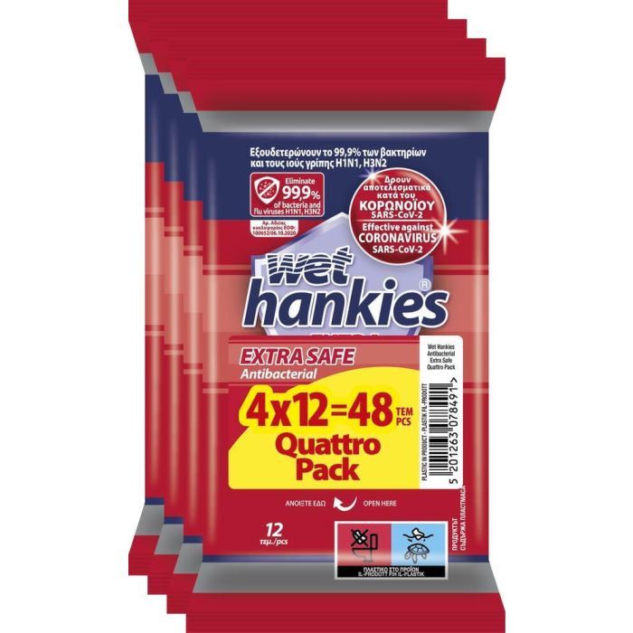 Wet Hankies Еxtra Safe Мокри антибактериални кърпи 4 х 12 бр Комплект