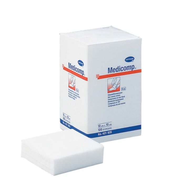 Hartmann Medicomp са хипоалергични нестерилни компреси с марлена структура, изработени от мек нетъкан материал с висока абсорбация. Не отделят нишки и не залепват за раната. Хартман Медикомп нестерилни компреси се използват за общо лечение на рани, като тампони или превръзки за малки рани, както и при интервенции в амбулаторни условия и болнични отделения. Компресите са 4 дипли, предлагат се в опаковка от 100 броя с размер 5x5 см.