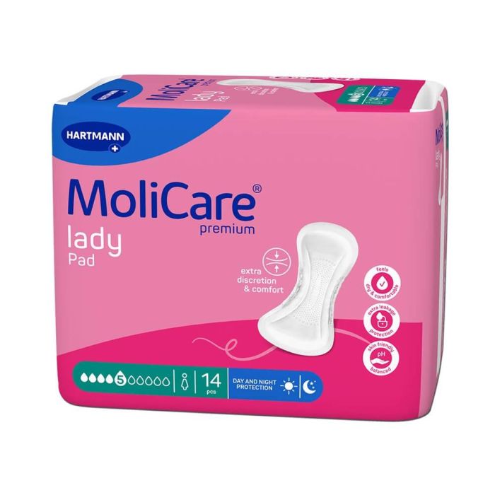 Hartmann MoliCare Lady Pad 5 drops представляват специално създадени подложки за жени, които осигуряват оптимален комфорт при симптоми на леко изпускане на урина, вследствие на генекологични интервенции, заболяване, обилна менструация или след раждане. Имат анатомична форма. Произведени са от мека, нетъкана материя със силни абсорбиращи свойства, която се грижи за вашето усещане за сухота и свежест. Хартман Моликеър Лейди Подложки за жени 5 капки са обогатени с екстракт от алое вера и имат успокояващ и антимикробен ефект. Дерматологично тествани.