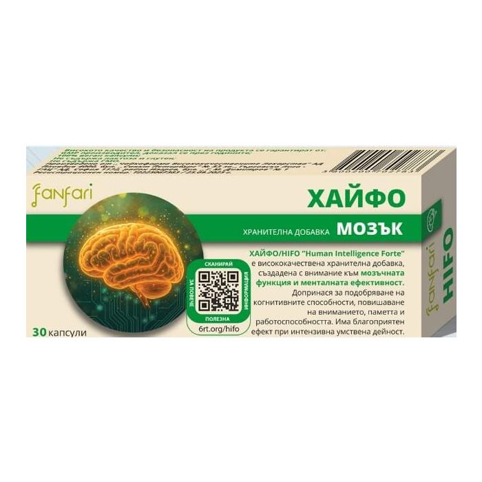 Хайфо е висококачествена хранителна добавка под формата на твърди растителни капсули, създадена да подпомага нормалната мозъчна функция и ментална ефективност. Допринася за подобряване на когнитивните способности, повишаване на вниманието, паметта и работоспособността. Има благоприятен ефект при интензивна умствена дейност.