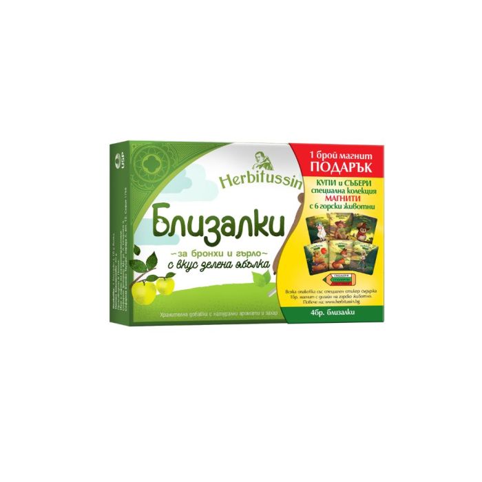 Herbitussin Близалки за бронхи и гърло с вкус на зелена ябълка се използва за намаляване на възпалението и дразненето в гърлото, фаринкса и устната кухина. Хербитусин Близалки за бронхи и гърло с вкус на зелена ябълка успокояват болката и облекчават дискомфорта, благодарение на съдържанието на билкови екстракти - екстракт от корен лечебна ружа, екстракт от листа градински чай, екстракт от цвят лайка, а съдържанието на витамин C спомага за укрепване на имунната система. Herbitussin близалки за бронхи и гърло съдържа концентрат от зелена ябълка , който придава приятен вкус за децата. За деца над 4 години. Предлага се в опаковка от 4 близалки.