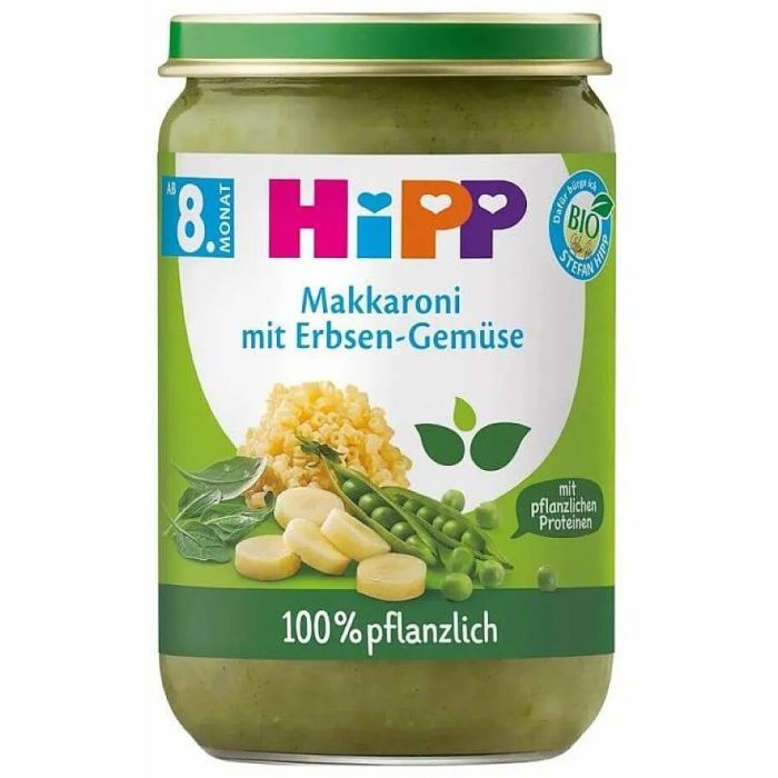 Hipp Bio Яхния от макарони с грах 8М+ e чудесната комбинация от грах и макарони, която ще допринесе за обогатяването на вкусовете и изграждането на полезни хранителни навици. Формулата, която е специално адаптирана към нуждите на бебето, съдържа и протеини, получени от растения. За пълноценно и удовлетворено бебешко коремче. Хип Био Яхния от макарони с грах 8М+ е подходящо за деца над 8 месеца.
