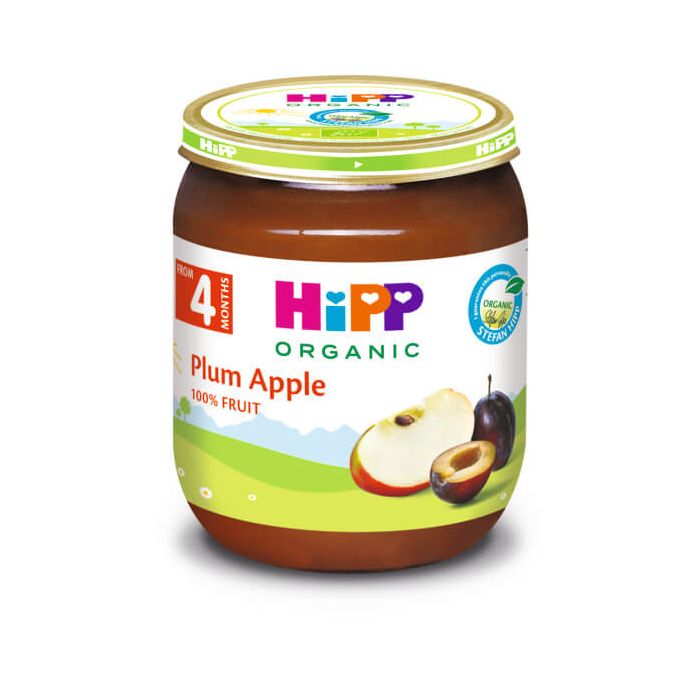 Hipp Bio Сливи и ябълки 4М+ е от плодове, отглеждани в специални, природосъобразни места, където няма наличие на химикали. Биологичното фермерство е в основната концепция за био продукти на марка HiPP. Хип Био Сливи и ябълки 4М+ е питателно пюре, с включени сливи и ябълки. В полезните сини сливи има множество витамини: B1, B2, PP, C, провитамин A, минерали и микроелементи: натрий, калий, магнезий, фосфор, желязо. Ябълката допринася с допълнително количество витамин C и фибри. И в двата плода се съдържат антиоксиданти.