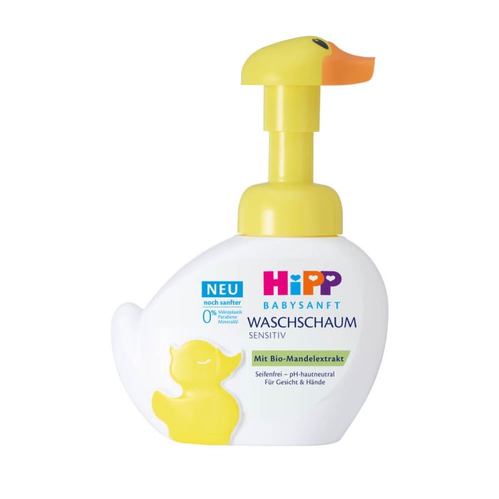 Hipp Babysanft Waschschaum Sensitiv е мека кремообразна пяна за нежно почистване на лицето и ръцете на най-малките. Хип Бебесанфт Измивна пяна за ръце и лице Пате почиства и същевременно хидратира и защитава нежната детска кожа от изсушаване. Има специална формула с неутрално pH, която не причинява дразнения на очите. Продуктът е обогатен и с екстракт от биологичен бадем, който се отличава с естествен подхранващ и защитаващ кожата ефект. Опаковката на измивната пяна е под формата на пате за повече забавление по време на измиване. Продуктът има деликатен хипоалергенен аромат. Не съдържа сапун. Не съдържа парабени, микро-пластмасови частици, минерални масла, оцветители и PEG емулгатори.