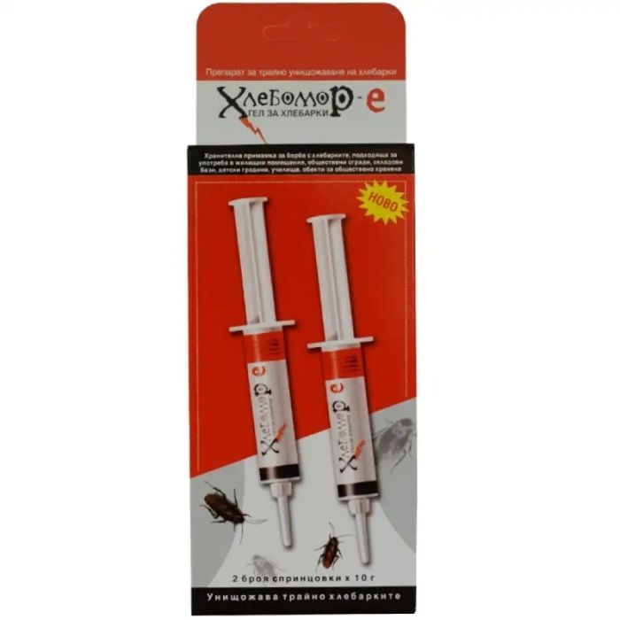 Хлебомор-К Гел спринцовки за хлебарки представляват спринцовка пълна с гел против хлебарки. Гелът се нанася лесно с помощта на спринцовката, като позволява да се попълнят лесно цепнатини и пукнатини, действа нервно-паралитично, стомашно-чревно и контактно. Хлебомор-К Гел спринцовки за хлебарки видимо намалява популацията между 6-ия и 8-ия ден. Намира приложение в жилищни помещения, здравни и лечебни заведения, обекти за производство и продажба на храни.