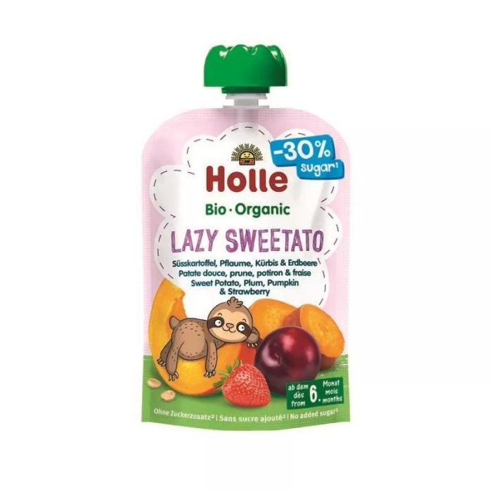 Holle Lazy Sweetato Био пауч сладък картоф, слива, тиква, ягода е здравословна закуска, която е богата на витамини и полезни хранителни вещества, подходяща за употреба след 6-ия месец на детето. Тя има балансиран състав и вкус, и децата ще я харесат. Практичната опаковка е удобна за консумация у дома и навън. Холе Био пауч сладък картоф, слива, тиква, ягода е без добавена захар и ще допълни добре балансираното хранене на детето.