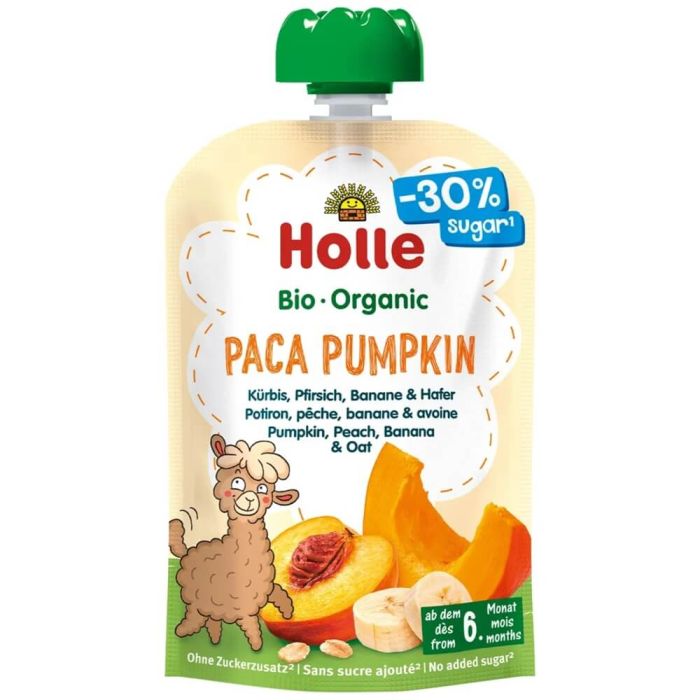 Holle Paca Pumpkin Био пауч тиква, праскова, банан и овесени ядки е здравословна закуска, която е богата на витамини и полезни хранителни вещества, подходяща за употреба след 6-ия месец на детето. Тя има балансиран състав и вкус, и децата ще я харесат. Практичната опаковка е удобна за консумация у дома и навън. Холе Био пауч тиква, праскова, банан и овесени ядки е без добавена захар и ще допълни добре балансираното хранене на детето.