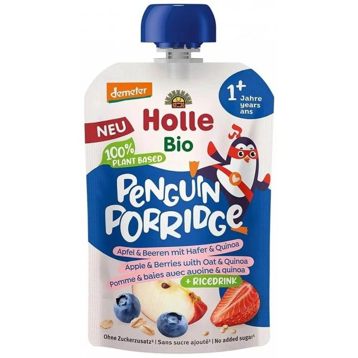 Holle Penguin Poridge Пауч с ябълка, горски плод и овесени ядки е чудесна здравословна закуска, която е богата на витамини. Подходящ е за деца, навършили 12 месеца. Базиран е на оризова напитка с добавени органични плодове. Практичната опаковка е удобна за консумация у дома и навън. Холе Пауч с ябълка, горски плод и овесени ядки е без добавена захар и ще допълни добре балансираното хранене на детето.