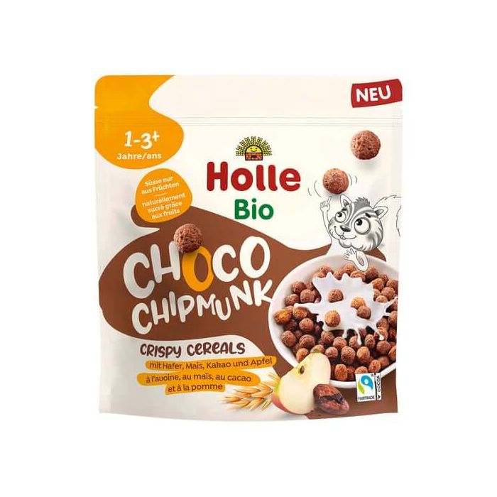 Със своята вкусна натурална рецепта Holle Choco Chipmunk Зърнена закуска с ябълка и какао е подходяща за деца от 1-годишна възраст и за цялото семейство. Пълнозърнестите овесени ядки и царевицата се допълват от естествено сладкия и плодов вкус на ябълките. Фино смляното какао на прах добавя перфектния вкус на шоколад. Холе зърнена закуска с ябълка и какао не съдържа палмово масло.