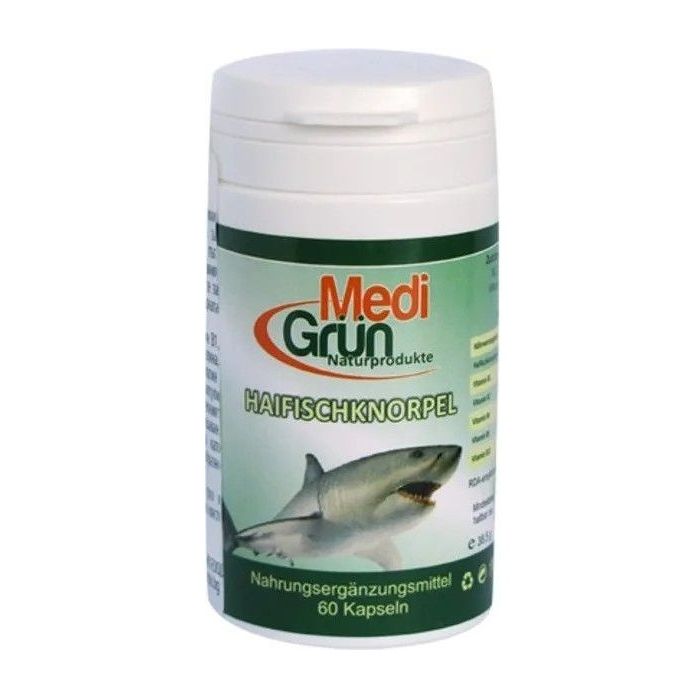 Shark`s Cartilage Medi Gruen съдържа богата комбинация от протеини и колаген, гликозаминогликани (включително хондроитин сулфат), минерали, като калций и фосфор, както и сложни въглехидрати и други биоактивни вещества. Тази формула подпомага здравето на ставния хрущял и съединителната тъкан, като действа превантивно за поддържане на активността и подвижността на ставите, особено с напредването на възрастта. Хрущял от акула Меди Груен се препоръчва, като имуностимулатор.