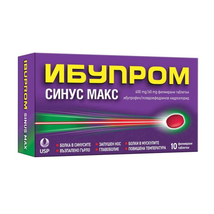 Ibuprom Sinus Max е лекарствен продукт с аналгетично, противовъзпалително и антипиретично действие. Ибупром Синус Макс при грип, настинка и синузит намалява назалната конгестия и количеството на отделяния секрет. Почиства носа и параназалните синуси.