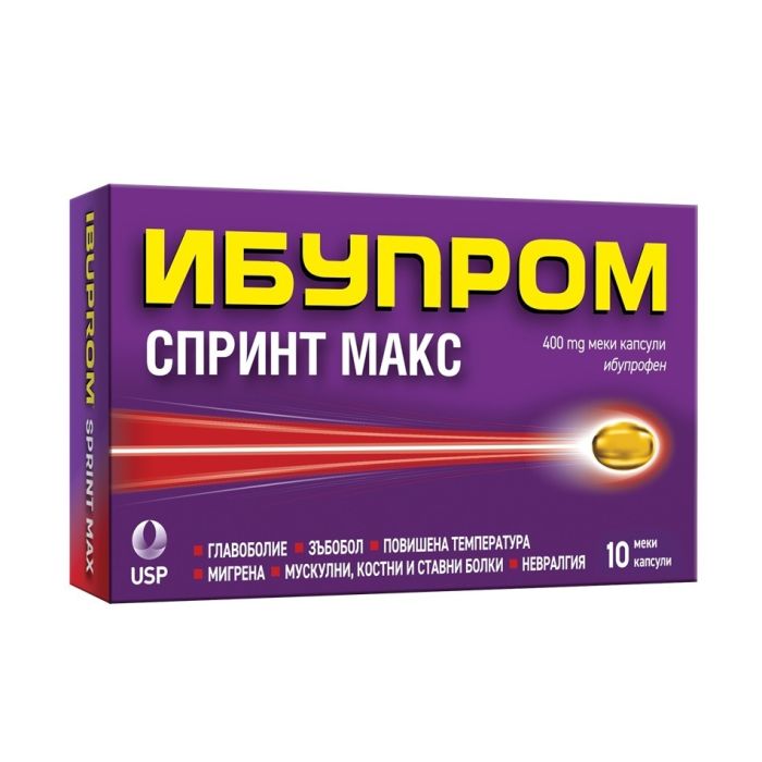 Ibuprom Sprint Max е лекарствен продукт без лекарско предписание, който се използва за облекчаване на лека до умерена болка от различен произход, като главоболие, мускулна болка, болка в кръста, болка в ставите и костите, зъбобол, възпалителни заболявания на нервите, мигрена, менструални болки, както и за намаляне на висока температура. Действието на Ибупром Спринт Макс е два пъти по-бързо, благодарение на течния разтвор на активната съставка Ибупрофен. След поглъщане желатиновата капсула много бързо се разгражда в стомашния сок, като освобождава течния ибупрофен, който може веднага да се резорбира от тялото и да достигне бързо до мястото на болката. Предлага се в удобна опаковка от 10 меки капсули.